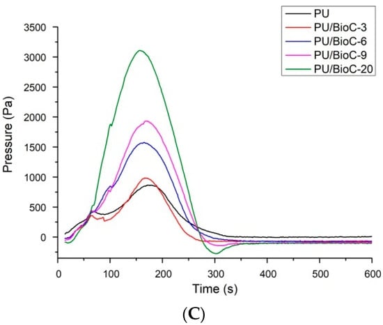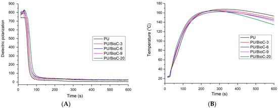 Influence of BioC on dielectric polarization (A), temperature (B), and pressure (C) changes of reaction mixture during foaming of polyurethane systems.