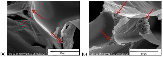 Table 2 and Table 3 show parameters of cellular structure and SEM photographs of the foams cross-sections (parallel and perpendicular to the foam growth direction). The anisotropy index is defined as the ratio of cell length to cell width. Cells are assumed to be spherical, if the value of this parameter is 1. The introduction of the filler led to elongation of the cells in a parallel direction, as confirmed by values of the anisotropy coefficient above 1. Cell elongation in the direction of foam growth is related to the initial viscosity of polyurethane systems. Moreover, the application of fillers to a polyurethane system may lead to the nucleation process of the cells of a rigid polyurethane foam [,]. This creates more cells while reducing their sizes. In the case of our studies, this effect was also observed—the introduction of BioC resulted in a decrease in the cross-sectional area of the foam cells. The reduction took place in directions both perpendicular and parallel to the foam growth direction. A similar effect has been observed for rigid polyurethane foams modified with expanded graphite []. Rigid polyurethane foams consist of 12- and 14-sided structures in the shape of pentagonal dodecahedrons []. Between three and more cells there are parts called struts. The filler particles used in our experiment are mostly located in these spaces, which is confirmed by SEM micrographs shown in Figure 5.