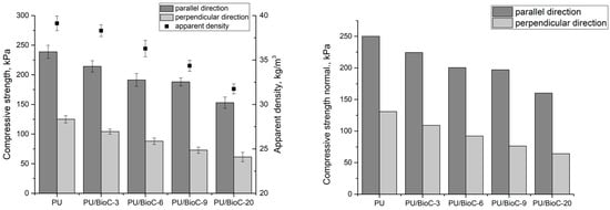The mechanical strength depends on the apparent density and cell structure of the foams, i.e., the size and uniformity of the cells []. A higher density is associated with more compact cellular structures, hence more material per unit area and a higher strength of the foam material. Figure 6 shows the mechanical strength () and normalized compressive strength (σnorm) of the BioC-modified foams. Compression experiments were calculated with respect to a density of 40 kg/m3. The equation used for the normalization of strength is as follows []: