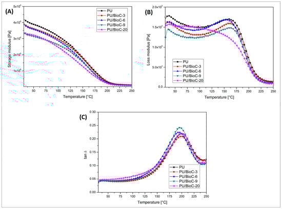 The results of the viscoelastic properties evaluation are presented in the form of DMTA plots. The thermograms presented in Figure 8 present the storage modulus, loss modulus and tan δ values. When looking at the storage modulus plots, it is clear that the addition of the BioC particles led to a visible decrease of the polyurethane foam stiffness. The decrease in storage modulus values was visible in the whole range of the DMTA measurement, while it is also clear that the increasing content of the BioC particles led to lower stiffness. The results of the storage modulus evaluation strongly correspond with the results of the compression tests. The use of stiff filler particles did not have any strong effect on the potential strengthening of the material structures. In the case of the foams, the pore formation process and the resulting lower apparent density had a decisive influence on the mechanical properties.