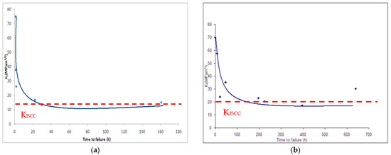 Following the procedures described in Section 3 and Section 4, CNT specimens of 4340 steel were tested in 0.1 N NaCl (i.e., similar to the solutions used in earlier studies [24,25]). ‘Cantilever bend’ [24] and ‘centre cracked’ [25] were the specimen types employed in earlier studies. From the plot of KI vs. time-to-failure (Tf) (Figure 7), KISCC of 4340 steel was determined to be ~15 MPa·m1/2. KISCC of this steel in 0.1N NaCl was reported [24,25] to be 14–16 MPa·m1/2, as shown in the band in Figure 7. Thus, KISCC of 4340 steel determined using CNT specimens (~15 MPa·m1/2) is within this band, which validates the CNT technique for the accurate determination of KISCC.