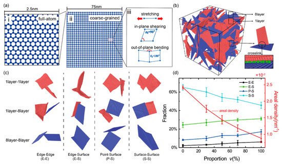 Coarse-grained model of bi-modal GrFs. (a-i) A square full-atomic graphene sheet with a side length of 2.5 nm; (a-ii) A square coarse-grained graphene sheet with a side length of 75 nm; (a-iii) three deformation modes of stretching, in-plane shearing and out-of-plane bending of graphene sheet; (b) The initial state of a well-equilibrated coarse-grained GrF consisting of the same number of 1-layer flexible (red) and 8-layer stiff (blue) coarse-grained graphene sheets; The crosslinks (green) are added between neighbor beads in different sheets. (c) Four typical microstructures of edge–edge (E–E), edge–surface (E–S), point–surface (P–S) and surface–surface (S–S) for two 1-layer sheets, a 1-layer sheet and a 8-layer sheet, and two 8-layer sheets; (d) The fraction of the four typical microstructures and the areal density (the contact area between sheets per unit volume) as an increased proportion of stiff sheets (the number of stiff sheets divided by the total number of sheets).