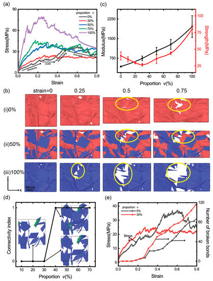 (a) The uniaxial tensile stress–strain curves of the GrFs with varied proportions of 8-layer stiff sheets v = 0, 30%, 50%, 70% and 100%; (b) The snapshots of the microstructural evolution of the GrFs with v = 0, 50% and 100% at four tensile strains of 0, 0.25, 0.5 and 0.75, respectively; (c) The modulus and strength of the GrFs as a function of the proportion of stiff sheets. (d) The connectivity of the GrFs with varied proportions of stiff sheets (The connectivity of the system is set to be 1 if the connected stiff sheets can run through the entire system in the loading direction; otherwise, it is 0); (e) The stress and the number of broken bonds in the GrFs with v = 0 and 30% as a function of tensile strain.