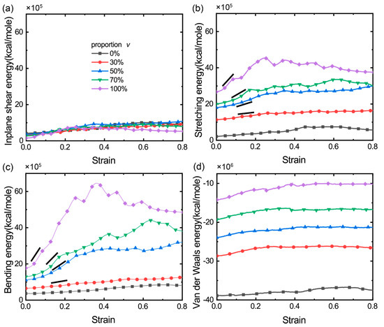 To further understand the deformation of bi-modal GrFs, we calculate the total stretching energy , in-plane shearing energy , out-of-plane bending energy and van der Waals energy for the GrFs with varied v, where ,, , and are calculated by the Equations (1)–(5), respectively. Figure 3a shows that the total in-plane shearing energy of GrFs increases slightly with an increased tensile strain and saturates at a critical tensile strain of ~0.4; in particular, it is almost independent on v. This is consistent with our previous finding [27] that the shearing deformation of sheets is not the main deformation mode in GrFs and that the shearing energy of GrFs always keeps a small value regardless of the characteristic of the constituent graphene sheets. For the two other kinds of deformation modes, the stretching and bending of sheets, as shown in Figure 3b,c, on the one hand, the respective elastic energy of the two modes is larger than the corresponding shearing energy in Figure 3a, which indicates that the bending and stretching of sheets are still the main deformation modes in the bi-modal GrFs, as in in the GrFs composed of a single thickness of sheets [27]; on the other hand, both kinds of energy increase with an increased v at any given tensile strain; here, we note that the initial crosslink density, as well as the local connectivity of neighbor sheets, are almost the same for samples, so in the early stage of tension, because there is no bond breaking, the sheets in systems would experience almost similar stretching/shearing/bending deformations due to the same constrains imposed by crosslinks; however, due to the huge difference in stiffness and strength of 1-layer flexible sheets and 8-layer stiff ones, the immediate stress level, as well as the initial modulus of the GrF with more stiff sheets (larger v), show larger values as observed in Figure 2a,c. Moreover, the van der Waals adhesion energy Figure 3d exhibits a similar dependency on v as that of the stretching/bending energy; from the structural analysis in Figure 1d, we know that the GrF with more stiff sheets is apt to be a state with less inter-sheet contact area, which is responsible for the increase of the van der Waals energy as shown in Figure 3d. For the pure GrF or the GrF with 30%, the stretching/bending energy of the system increases much slightly with an increased tensile strain, as indicated by the slope bar; in sharp contrast, for the GrF containing more 8-layer sheets, e.g., v = 50%, 70% and 100%, the stretching/bending energy of the system increases obviously with an increased tensile strain, especially in the stage with the tensile strain <0.4; see the respective slope bar. This difference in the change of the stretching/bending energy at the critical value of v = ~30% indicates that the deformation mode of the system has shifted from being dominated by flexible sheets to being dominated by stiff sheets, which is consistent with the finding by the connectivity analysis as discussed in Figure 2d.