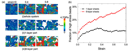 (a-i) The distribution of the local von-Mises stress of the whole GrF system with v = 50%; for a direct comparison of the stress distribution in 1-layer sheets and 8-layer sheets, the two parts are displayed separately in (a-ii) and (a-iii); (b) The comparison of the ratio of high stress beads in 1-layer sheets and 8-layer sheets in the GrF with v = 50%.