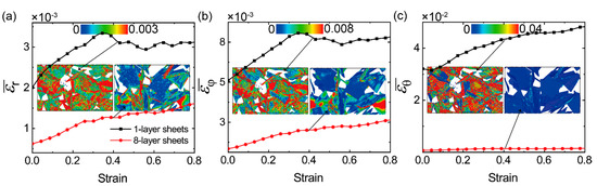 In order to understand the role of flexible sheets and stiff ones in bi-modal GrFs in tension process, we study the distribution and evolution of local stress and strain in both 1-layer flexible and 8-layer stiff sheets. Figure 4a-i shows the distribution of local von-Mises stress in both flexible sheets and stiff ones in the GrF with v = 50%. In the initial state with the tensile strain ε = 0, the system is well equilibrated; then, with an increased tensile strain from 0 to 0.8, more and more high tensile stress regions as color coded by red emerge in the system. By separately displaying the stress distribution in flexible sheets and stiff ones in Figure 4a-ii,a-iii, we find that the high-stress regions mainly locate in stiff sheets, especially at the larger tensile strain of 0.4 and 0.8, which is mainly attributed to the poor deformation coordination ability of stiff sheets compared to the flexible ones. Furthermore, we count the number of the “high-stress beads”, defined as the magnitude of local von-Mises stress σvm being larger than the average value of the system, i.e., |σvm|>, where N is the number of beads in the system. Figure 4b shows that the fraction of high-stress beads in stiff sheets is always larger than that in flexible ones; the curve related to 1-layer sheet is not monotonous, because the bonds in 1-layer sheets are broken ceaselessly with increasing strain. It should be noted that the aggregation of high-stress regions in stiff sheets also holds in the GrFs with the proportions of v = 30% and 70%, as shown in Figure S1 in Supplementary Information.