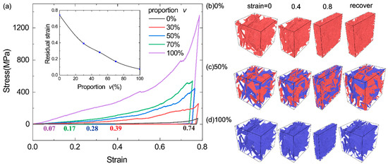 We also examine the elastic recovery of the GrFs with v = 0, 30%, 50%, 70% and 100% in the compression–uncompression process. The systems are first compressed to a maximum compressive strain of 0.8 at a loading rate of 4.3 × 106 s−1 in x direction and then uncompressed for a long time (20 ns) to fully relax. The stress–strain curves for the five GrFs in the compression–uncompression process are shown in Figure 6a, and none of them recover completely due to the microscopic plasticity unveiled in the works [47,56]. The residual strain for the five systems is 0.74, 0.39, 0.28, 0.17 and 0.07, respectively, which decreases with an increased v, as shown in the inset in Figure 6a. The corresponding snapshots of the compression–uncompression process of the three GrFs with v = 0, 50% and 100% are given in Figure 6b,d for intuitively showing the enhancement of the elastic recovery of GrFs with 8-layer sheets. This can be explained using our previous work [27] about the GrFs composed of mono-layer graphene sheets; at a given crosslink density, more elastic energy can be stored in the GrF composed of more stiff sheets as it is compressed. So, we can increase the proportion of stiff sheets in a bi-modal GrF to obtain a good elastic recovery ability in compression in practical applications.