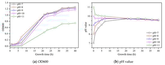 As seen in Figure 1a, the change of OD600 with growth time represents the grow curve of S. pasteurii. The growth curves of all samples can be divided into three stages from Figure 1a: a lag phase, an exponential phase, and a stationary phase. During the lag phase, S. pasteurii tends to adjust to the high nutrient environment and prepares for fast growth [19]. During the exponential phase, the growth of cells becomes faster and consumes nutrients at a fast rate. During the stationary phase, the growth rate of S. pasteurii gets hindered due to the depletion of nutrients. When the initial pH is increased from 7 to 9, the change of OD600 of each sample follows a similar trend: first increasing slowly, followed by a quick increase and, finally, a stable stage. At an initial pH of 10, OD600 gets a slight decrease compared to the former three samples at every growth time. However, when the initial pH reaches 11, OD600 becomes close to 0 after 7 h of growth and then increases while the increasing rate is much lower than others. The final value of OD600 is about 0.7, which is the lowest value. This can be ascribed to the high alkalinity in the culture medium, which can hinder the growth of S. pasteurii.