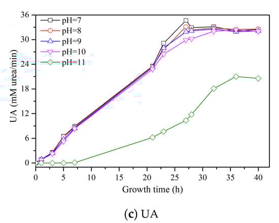 Figure 1c shows the change of UA with a growth time of S. pasteurii under different initial pH values. When the initial pH rises from 7 to 10, the UA values of all samples follow an almost same changing trend, which are increased with the growth time and reach a stable value at last. When the initial pH is 11, the UA has almost no change at the first 7 h growth time, followed by a gradual increase until a stable value of 22 mM urea/min is reached, which is much lower than that for others, i.e., approximately 33 mM urea/min.