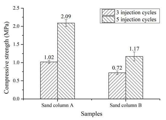 Figure 2 shows the compressive strength of the cemented sand columns after three and five injection cycles of bacterial solution and cementation solution. As the injection cycles increase from three to five, the compressive strength of each sand column increases. The compressive strength of specimen sand column A is increases by 50.72% from 1.38 to 2.08 MPa, while the compressive strength of specimen sand column B is increased by 61.11% from 0.72 to 1.16 MPa. The increase of compressive strength of each sand column by more than 50% with increasing injection cycles from three to five indicates that after five injection cycles can promote the gain of compressive strength. Compared to specimen sand column B, the specimen sand column A has a higher compressive strength, regardless of the injection cycles. As introduced in Section 2.1, the sand particle size of sand column A is smaller than that of sand column B. The space between sand particles of sand column A is small and, thus, the space for MICP between sand particles is small. Hence, at the same injection cycles, the required less calcium carbonate is required for filling in the space between sand particles, resulting in a faster filling of MICP in the space between sand particles and then a gain of compressive strength. When the injection cycle is higher, more calcium carbonate would be generated to fill in the space between sand particles and, therefore, the compressive strength would be higher. The injection cycles and average sand grain size play an important role in the compressive strength of bio-cemented sand column. It was reported by Yu [20] that the compressive strength of bio-sandstone with sand particle range of 0.212–0.525 mm after two, four and six injections of bacterial solution and substrate solution is 0.37, 0.63 and 1.33 MPa, respectively. A highest compressive strength of 0.58 MPa of sand column can be obtained, which is much higher than that of untreated sand with the same density, i.e., below 0.20 MPa [21]. In our study, the compressive strength of sand column A with sand particle range of 0.16–0.315 and 0.63–1.25 mm is 2.09 MPa with five injection cycles, which is much higher than that reported in [20] of 1.33 MPa with six injections. Moreover, the strength of sand column B with a sand particle size of 0.315–0.63 and 1.25–4.75 mm is 0.72 MPa with three injection cycles, which is also higher than that reported in [20] of 0.63 MPa with four injections. Although there are differences in these two experiments, the strength of the sand column with a high average particle size and lower injection cycles in our study is still higher than that reported in [20], which is likely to be attributed to the different injection methods used, suggesting that our injection method is more efficient. Multiple injections of bacterial solution and substrate solution can facilitate the gain of compressive strength of bio-sandstone. A smaller average particle size of sand column can lead to a more efficient gain of compressive strength.