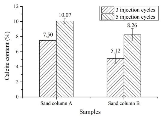 The calcium carbonate content of each sand column with three and five injection cycles is shown in Figure 3. The content of calcium carbonate in the sand column increases with the increase of injection cycles from three to five cycles. The calcium carbonate content in sand column A is increased by 34.31% from 7.5% to 10.07%, while the calcium carbonate content in sand column B is increased by 61.93%, from 5.12% to 8.26%. This indicates that increasing the injection cycles is beneficial to the increase of the calcium carbonate deposition content in the sand column. The content of calcium carbonate in sand column A is higher than that in sand column B at each injection cycle. The average particle size of sand in sand column A is smaller than that in sand column B and less empty space exist between the sand particles in sand column A, as a result of which less calcium carbonate is required to fill the space between sand particles. Therefore, at the same injection cycles, sand column A can achieve a better filling effect, and the calcium carbonate generated by its deposition can fill the space between sand grains faster.