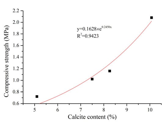 The relationship between the calcium carbonate content and compressive strength of the sand columns is shown in Figure 4. With the increase of the calcium carbonate content, the compressive strength of the sand column is increased. When the calcium carbonate content is less than 8%, the increment of compressive strength is small with increasing calcium carbonate content, which is consistent with the finding presented in [22], which showed that the low calcite content did not significantly improve the compressive strength of the sand column samples. When the calcium carbonate content is higher than 8%, a significant increment of compressive strength with the increase of calcium carbonate content can be found. This agrees with the finding for bio-sandstone that the sample with the maximum amount of CaCO3 had the highest compressive strength [22]. Five injection cycles were found to be efficient to gain compressive strength of the sand column. Whiffin [9,15] demonstrated that there is a good correlation between the UCS of the sand column and the calcite content, that is, when the calcite content is less than 3.5% or 60 kg/m3, the compressive strength of the sand column has no obvious improvement but is enhanced significantly when the calcite deposition is more. According to the change trend between the calcite content and compressive strength, the correlation between them may conform to an exponential function, shown in Equation (3). The exponential relationship between the compressive strength and calcite content is in line with that reported in the literature [23,24,25,26,27]: