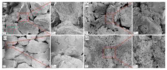 Figure 5 displays the microstructure of cemented sand columns with different injection cycles. As seen in Figure 5a of the microstructure of sand column A with three injection cycles, a lot of fine grains exist among the intersection of sand particles and the size of fine grains is about 2–5 µm with irregular shape. Some pores among sand particles can be observed. Figure 5b shows the microstructure of sand column A with five injection cycles, where more irregular shape grains can be found around the sand particles. Obviously, a layer of generated substance coats the surface of sand particles, which are cemented with each other, and thus, the whole sand body gains compressive strength. Moreover, the pores between sand particles are smaller than that of sand column A with three injection cycles, suggesting that more injection cycles would generate more calcite crystals and fill in more pore space. With the increase of injection cycles, the number of pores of the cemented sand column reduces so that the inner structure of the cemented sand column is being compacted step by step [28]. Figure 5c illustrates the microstructure of sand column B with three injection cycles, indicating that although some fine grains are generated, there are not enough grains to fill in the space among sand particles. In addition, the average sand particle size of sand column B is larger than that of sand column A, the pore space among sand particles is larger. As a result, more fine grains are required to fill the pores; on the other hand, the generated fine grains are more easily washed away during the process of injection. Figure 5d shows the microstructure of sand column B with five injection cycles. A layer of substance can be found on the surface of sand particles, and the pore space among sand particles is filled with fine grains, while some interspaces among the fine grains can be found, which is the weak point.