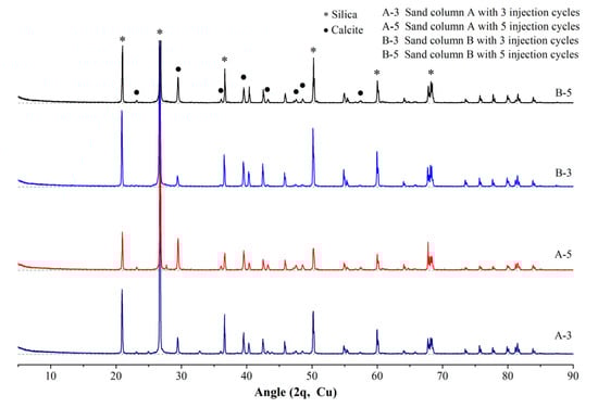 According to the literature, the crystal types of calcium carbonate are multitudinous, including calcite, vaterite, aragonite and amorphous calcium carbonate, and different crystal types of calcium carbonate possess different properties [29]. For example, calcite is the most stable among them. Effective crystals are those which precipitate in the pores of the soil and bond soil particles to each other like a bridge, to tolerate the imposed load between soil particles and enhance the specimen’s strength [30]. Thus, to clarify the crystal type of the generated calcium carbonate is very important, as some sand particles, including the generated calcium carbonate on its surface, were ground to powder for the XRD analysis. The XRD patterns of the samples with different sand columns and injection cycles are presented in Figure 7. From Figure 7, for every specimen the intensity of silica characteristic peaks are significantly high, which is because the main composition of sand particles is silica; thus, the results are predictable. Otherwise, the diffraction peaks of calcite are different for every specimen. It can be indicated that calcite is the fine grains generated on the surface of sand particles in Figure 5. The intensity of the diffraction peak of calcite increases with the increase of injection cycles from three to five cycles and the decreases with the increase of sand particle size from small to large. The intensity of diffraction peak can reflect the content of the detected substance. Therefore, from Figure 7, calcite content of sand column A with five injection cycles is the highest, followed by sand column B with five injection cycles, sand column A with three injection cycles and sand column B with three injection cycles, for which the changes in compressive strength and calcite content are described in Section 3.2 and Section 3.3.