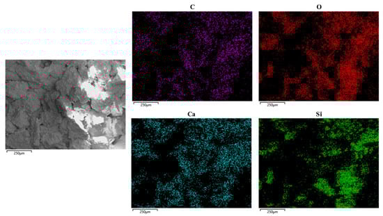 To analyse the distribution of the generated calcite around sand particles, a debris of sand column A-5 without a gold coat was tested by means of SEM-EDS with mapping, the result of which is presented in Figure 8. The distribution of elements C, O and Ca is almost identical, suggesting that the substance distributed in these areas is calcium carbonate. At the same time, the distribution of elements of O and Si is almost identical as well. SiO2 exists at the same distribution areas. The distribution of Ca can represent the distribution of calcium carbonate. As seen in the EDS mapping, the distribution of calcium carbonate is broad and uniform.