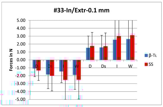 Graphic representation of the forces generated at 0.1 mm of the intrusion and extrusion of the canine (#33). SS: stainless steel; β-Ti: beta titanium; D: discovery® MIM; Ds: discovery® smart; W: WiN; I: Incognito™; N: Newton.