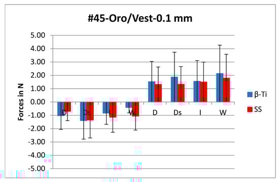 In most cases, the forces generated by the bracket/β-Ti combination were slightly lower than those generated from the combination of the SS wire with the same bracket appliance (Figure 2). On the contrary, in 20 out of 96 cases, the β-Ti wires generated slightly higher forces as shown in Figure 3. All these cases represented orovestibular movements.