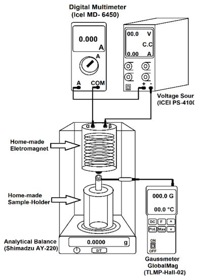 where Fmn is the magnetic force normalized by the initial mass of the sample m0, Δm is the apparent variation of mass in the magnetic field’s presence, and g is the acceleration of gravity. The Figure 1 shows the magnetic force test.