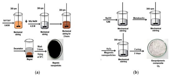 Modification process of magnetic nanoparticles with SiO2 (a) and production of geopolymer composites (b).
