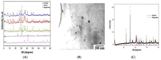 X-Ray diffraction (A): (a) geopolymer wt 3%; (b) geopolymer wt 2%; (c) geopolymer wt 1%; (d) magnetic nanoparticles; (e) magnetite. (B) TEM of the magnetite and (C) Full Profile Search Match quantification quartz and magnetite.