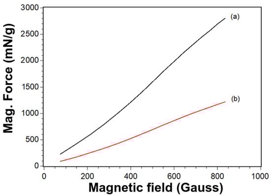 Magnetic force tests were performed using a homemade experimental setup, described elsewhere. This setup is constituted by an analytical balance Shimadzu (Kyoto, Japan) AY-220, a voltage source ICEL PS-4100, a digital multimeter ICEL MD-6450, a gaussmeter GlobalMag TLMP-Hall-02, a homemade sample holder; and a homemade electromagnet, located at the Instituto de Macromoléculas Professora Eloisa Mano, Rio de Janeiro, Brazil. System calibration was performed in the absence of magnetic material. Firstly, using the amperemeter and the gaussmeter, a current versus magnetic field calibration was performed. Afterward, a current versus mass calibration was also performed. Obtained results were used to predict part of the presented error. Magnetic force tests were performed following the mass variation of the sample in the magnetic field’s presence, produced by the electromagnet. Then, the apparent variation of mass of the sample in the presence of the magnetic field was calculated by subtracting the sample’s mass in the magnetic field’s presence from the sample’s mass. The magnetic force (opposite to gravitational one) was calculated according to Equation (3):