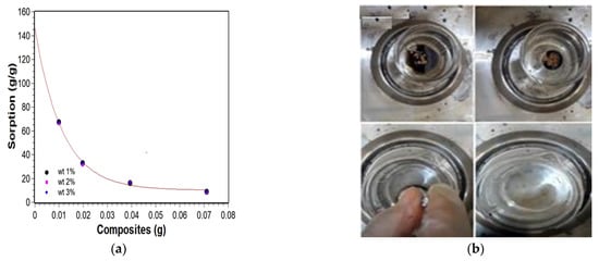 The sorption tests were performed following the analytical method from the Biopolymers and Sensors Lab []. The obtained results are shown in Figure 7. The geopolymer composites were subjected to the sorption process in order to evaluate the material’s ability to retain the contaminant in its structure, which, in this case, is oil. For this, the tests were performed, and the results obtained are shown in Figure 7. Using QtiPlot, graphs were plotted using the function showed in Equation (5):