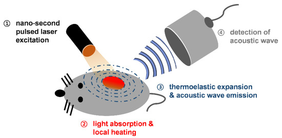 Photoacoustic imaging (PAI) is a new biomedical technology that provides dual image contrast by merging optical and acoustic imaging techniques. Thanks to its hybrid imaging properties, PAI is able to visualize relatively deep tissue (i.e., several cm) while maintaining the excellent resolution of its acoustic component [15,16,17,18]. Figure 1 indicates the basic principles of PAI. When a high-energy laser pulse strikes the sample, the light pulse is absorbed and converted into thermal energy. As the sample’s temperature increases, thermoelastic expansion occurs accompanying acoustic emission; this phenomenon is called the photoacoustic (PA) effect [19]. The broadband acoustic wave emitted is then detected by ultrasound sensors. Because there is less scattering of an acoustic wave from living tissues compared to incident light, PAI achieves relatively deep tissue imaging compared to pure optical imaging. Given its ability to capture endogenous contrast absorbers in the body with an optimal wavelength laser, PAI can provide physical mapping information on blood vessels, lipids, collagen, and melanin [20,21,22,23,24], as well as estimates of physiological variables such as hemoglobin concentration, saturated oxygen ratio, and blood flow [25,26,27,28]. These advantages of PAI can contribute to resolving many problems in fundamental science and pre- and clinical research fields [29,30,31,32,33].