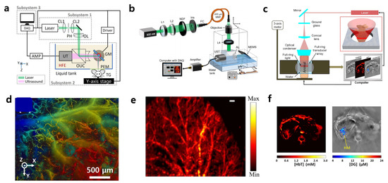PAM can create high-resolution images using a focused laser beam or a focused ultrasound capture scheme. Thanks to the high speed of lasers and fast scanning techniques such as micro-electro-mechanical systems (MEMS) and galvo-scanners, PAM can produce images in real-time [50,51,52,53,54,55,56,57]. When the spatial resolution is determined by a small, focused laser beam spot, the technique is called optical-resolution PAM (OR-PAM) (Figure 2a). OR-PAM can show the microvasculature of a mouse ear with a resolution on the order of several micrometers (Figure 2d). However, the penetration depth of OR-PAM is normally limited to approximately 1 mm because of the light diffusion in biological tissue. When the tighter ultrasonic detection bounds become the determining factor for spatial resolution, it is called acoustic-resolution PAM (AR-PAM) [51,58,59,60]. Even when AR-PAM does not provide better spatial resolution than OR-PAM, it can achieve a greater penetrating depth of a few millimeters because there is less ultrasound scattering in biological tissue (Figure 2b). Optical excitation is realized through dark-field illumination in AR-PAM, achieving a spatial resolution of 53 μm with an imaging depth of 1.8 mm in vivo (Figure 2e).