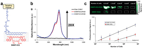 (a) Illustration of SWNT conjugated with ICG dye (SWNT-ICG). (b) Optical spectra of plain SWNT (black), SWNT-ICG-RGD (blue), and SWNT-ICG-RAD (red). (c) Photoacoustic image (upper) and quantitative photoacoustic signals (lower) from cancer cells exposed to SWNT-ICG-RGD and SWNT-RGD. Reprinted with permission from [70]. Copyright, American Chemical Society (2010).
