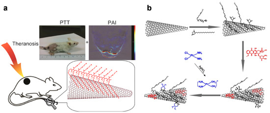 Single-walled carbon nanohorns (SWNHs) are from the family of nanocarbons and are, in principle, obtained from graphene sheets, similar to single-walled carbon nanotubes (SWCNTs), by oblique rolling into a cone shape. The conical-shaped material is sp2-hybridized and semi-conducting, similar to CNTs, and typically forms dahlia-like or bud-like aggregates, which are composed of thousands of horns. The overall diameter of SWNH aggregates measure from 80–100 nm on average, which is favorable for the enhanced permeability and retention (EPR) effect. Furthermore, the aggregates are biocompatible and free from metal impurities and absorb long-wavelength light (e.g., red or near-infrared). Therefore, SWNHs have been widely used in biomedical applications, including drug delivery and bio-imaging [71,72,73]. Figure 4 shows the role of SWCNTs in PA imaging applications. Notably, Chen et al. encapsulated SWCNTs with a hydrophilic, polyethylene glycol-based polymer (C18PMH-PEG) to maintain water dispersibility and then investigated the imaging capability (Figure 4a). The composite materials absorbed NIR light, showing their potential in photothermal therapy as well as in PA imaging in vivo [74]. Figure 4b presents multifunctional SWNHs that enable synergistic therapeutic effects. Yang et al. coated SWNHs with biocompatible polymers {i.e., poly (maleic anhydride-alt-1-octadecene) and poly (ethylene glycol) methyl ether-b-poly (D,L-lactide)}, and loaded two types of drugs such as cisplatin and doxorubicin. The drug-loaded SWNHs not only generated a PA signal and heat when irradiated at 808 nm, but also exhibited a sustained release of drugs in tumors, which enabled PA imaging-guided chemo-photothermal therapeutics [75].