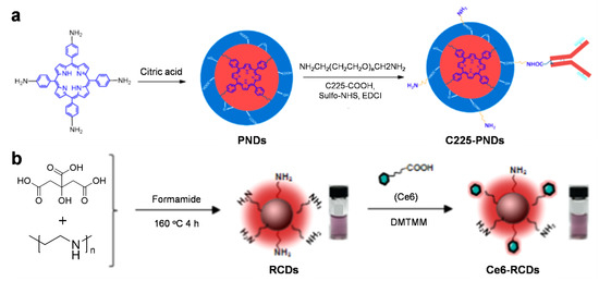 (a) Proposed formation pathway of PNDs and the synthesis routes of C225-PNDs. Reprinted with permission from [77]. Copyright, American Chemical Society (2018). (b) Schematic of the preparation of amino-rich red emissive carbon dots (RCDs) and Ce6-modified RCDs (Ce6-RCDs). Reprinted with permission from [78]. Copyright, American Chemical Society (2019).