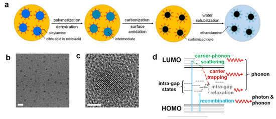 Synthesis of N-CNDs and the effect of nitrogen doping. (a) Synthesis of N-CNDs. (b) TEM image of N-CNDs (scale bar = 5 nm). (c) Partial graphitic structures in the core of N-CNDs (scale bar = 2 nm). (d) Illustration of electronic structures and nitrogen-induced intra-gap states of N-CNDs. Reproduced with permission from [39]. Copyright, Ivyspring International Publisher (2016).