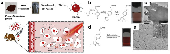 (a) Schematic illustration of HBCDs derived from Hypocrella bambusae (HB) for bimodal FL/PA imaging and synergistic PDT/PTT of cancer. Reprinted with permission from [81]. Copyright, Elsevier (2014). (b–e) Preparation and characterization of C-dots: (b) synthetic route to PPA (inset: the photograph shows that the PPA is insoluble in water). (c) TEM image of PPA. (d) synthetic route to C-dots (inset: the photograph shows water-dispersible C-dots). (e) TEM and high-resolution TEM (HRTEM) images of C-dots. Reproduced with permission from [82]. Copyright, John Wiley and Sons (2015).
