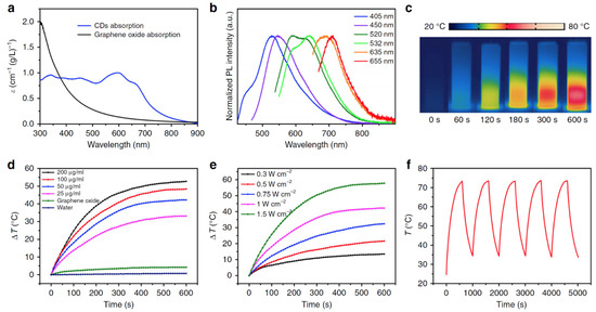 (a) Absorption spectra of sulfur-doped C-Dots in aqueous solution. The data from graphene oxide for comparison. (b) Emission spectra of the C-Dots that are excited at various wavelengths in dilute aqueous solution. (c) Photothermal images of the aqueous solutions of C-Dots (200 μg mL−1) that were captured at various times under 655-nm laser irradiation at a power density of 1 W cm−2. (d) Temperature evolutions of the C-Dots at various concentrations. The data from graphene oxide at 50 μg mL−1 and from pure water measured under the same conditions are shown for comparison. (e) Temperature evolutions of the C-Dots (50 μg mL−1) at various power densities. (f) Temperature curves of the C-Dots (200 μg mL−1) under five cycles of photothermal heating under 655-nm laser irradiation (1 W cm−2). Reproduced with permission from [83]. Copyright, Springer Nature (2020).