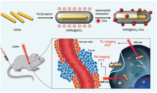 Schematic illustration of GNR@SiO2-CDs as a phototheragnostic agent for dual-modality FL and PA imaging-guided synergistic PDT/PTT therapy. Reprinted with permission from [91]. Copyright, The Royal Society of Chemistry (2016).