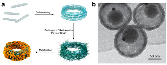 (a) Schematic illustration of the self-assembly of carbon nanotubes (CNTs) into a CNT ring (CNTR) and further growth of redox-active poly(4-vinylphenol) (PvPH) brushes via a surface-initiated atom-transfer radical-polymerization (SI-ATRP) method to reduce Au3+ to Au0 and coat gold nanoparticles onto the CNTR. Reprinted with permission from [92]. Copyright, American Chemical Society (2016). (b) Transmission electron microscopy (TEM) image of carbon-silica nanocapsules with gold nanoparticles (Au@CSN). Reprinted with permission from [93]. Copyright, John Wiley and Sons (2016).