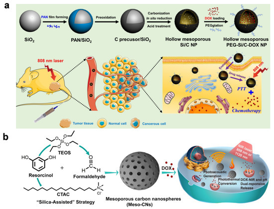 (a) Schematic illustration of fabrication of hollow mesoporous PEG-Si/C-DOX NP and its application for photoacoustic imaging-guided chemo-thermal therapy. Reproduced with permission from [96]. Copyright, Ivyspring International Publisher (2017). (b) Synthesis and application scheme for mesoporous carbon nanospheres (Meso-CNs) as photoacoustic agents and chemo-photothermal cancer therapy platforms. Reproduced with permission from [97]. Copyright, Ivyspring International Publisher (2018).