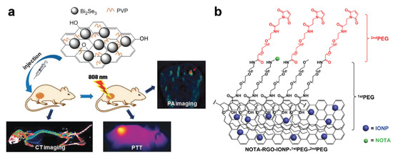 (a) Schematic diagram of GO/Bi2Se3/PVP nanocomposites for CT/PA imaging and PTT. Reprinted with permission from [86]. Copyright, The Royal Society of Chemistry (2017). (b) Schematic illustration of the structure of the NOTA-RGO-IONP-1stPEG-2ndPEG nanocomposite. Reprinted with permission from [85]. Copyright, The Royal Society of Chemistry (2016).