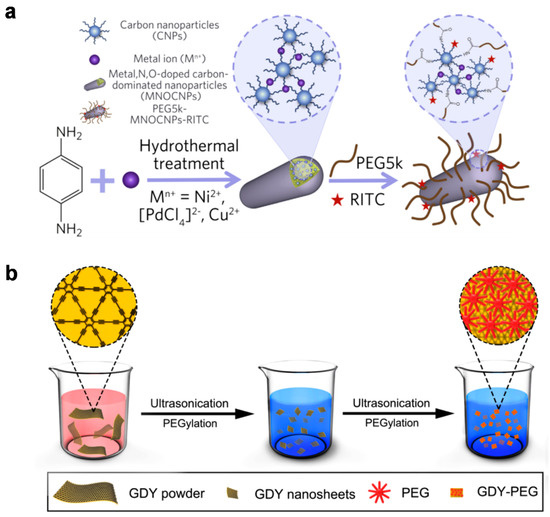 (a) Schematic illustrations of hydrothermal preparation and further modification of metal, N, O-doped carbon nanoparticles (MNOCNPs). Reprinted with permission from [108]. Copyright, Elsevier (2019). (b) Synthesis of the fabrication process of the PEG-functionalized graphdiyne material (GDY-PEG). Reprinted with permission from [118]. Copyright, American Chemical Society (2017).