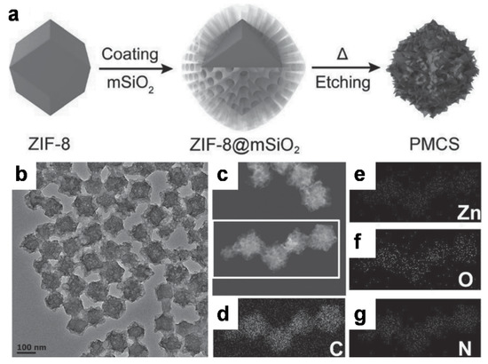 Metal-organic frameworks (MOFs) have provided a platform for the formation of carbon nanocomposites which are used in bio-imaging and phototherapy. Wang et al. demonstrated the formation of spherical carbon-based nanocomposites using the zeolitic imidazolate framework-8 (ZIF-8) [123]. The synthetic precursor was encapsulated by a mesoporous silica shell (SiO2) followed by pyrolysis at 800 °C and etching with sodium hydroxide; these resulted in the formation of monodisperse, metal-doped carbon nanospheres (PMCS) (Figure 14). The resulting materials contained meso-sized pores and porphyrin-like zinc centers (confirmed by elemental mapping) that played a role as photosensitizer in the carbon matrix; these were further coated with polyethylene glycol-vitamin E (PEG-VE) for biocompatibility. As designed, the PEGylated PMCS showed good stability and high photothermal conversion under 808 nm irradiation, and further enabled PA imaging and provided photodynamic properties for cancer treatment.