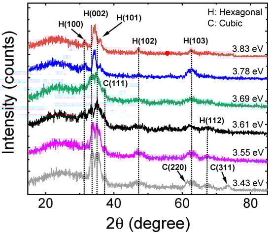 X-ray diffraction patterns measured with Cu-Kα radiation (wavelength: 0.154056 nm) for MgxZn1−xO thin films deposited with different Mg contents on room temperature soda lime glass substrates and annealed at 250 °C for 120 min. The samples are labelled according to their bandgaps.