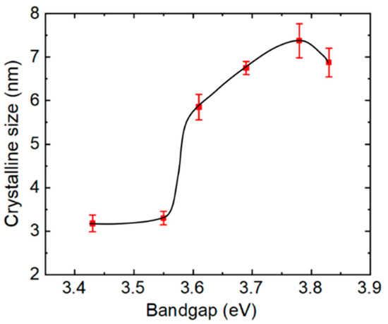 Figure 2 shows the results of calculations of crystalline size for the samples of Figure 1 determined from the widths of the diffraction peaks applying the Scherrer equation. The standard deviations arise from independent determinations from the (002), (101), (102), and (103) peaks, the four most visible diffractions in Figure 1. Because the Scherrer equation describes the average sizes of coherently scattering crystalline units in the sample, it represents a lower bound on the crystallite size due to the presence of intragranular disorder due to alloying, point and planar defects, as well as variations in strain which also contribute to peak broadening. The defective nature of the crystallites as a result of the low deposition and annealing temperatures of the MZO may contribute to the small sizes over the range from 3 to 8 nm in Figure 2. It is interesting that the largest lower limit on the crystalline size occurs for the higher x compositional range of ~0.3–0.4, corresponding to a bandgap range of 3.7–3.8 eV, suggesting a reduction in intragranular defect density or grain size with the increase in x. Similar observations have been made in previous studies of low temperature magnetron sputtered MZO films [37,38]. This improvement in crystallinity with x may occur due to relaxation of the structure made possible by the substitution of Mg at Zn lattice sites.