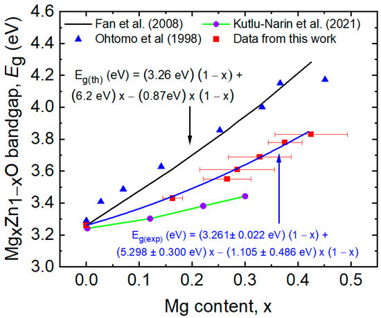 The reason for selecting the compositional range of x = 0 to 0.42 in this study is to span the range over which wurtzite is reported as the energetically favorable crystal structure and to avoid a dominant rocksalt phase that develops above x ≈ 0.5, depending on the deposition method and conditions [41,42,43]. It was found that an increase in substrate temperature can increase the Mg content of the single-phase MZO, and thus increase its bandgap, through the preferential desorption of Zn atoms [42,44,45]. Because the samples of Table 1 and Figure 3 were deposited at room temperature and annealed at 250 °C, any such enhancement in Mg concentration is avoided [16]. In this study in fact, the power applied to the MgO target is a factor of 2.5 times the power applied to the ZnO target to reach x = 0.42.
