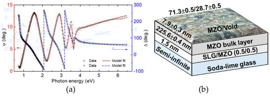 The solid lines in Figure 4a provide the final best fitting results for the MZO sample with x = 0.32 using the eight free parameter model whereby the optical model was reduced to five free parameters as described in the previous paragraph. Figure 4b shows the three best fitting structural parameters from this model including the bulk and surface roughness layer thicknesses of 225.6 ± 0.4 nm and 7.9 ± 0.3 nm, respectively. Application of the Bruggeman EMA led to a best fitting MZO content of 71.3 ± 0.5 vol.% in the roughness layer. Because the roughness layer thicknesses for all MZO samples are more than an order of magnitude smaller than the wavelength of the SE probe light within the material, even for the shortest probe wavelengths, then we expect that the EMA approach is valid and the structural analysis is accurate [52]. Previous studies of amorphous semiconductors, transparent conducting oxides, and metals have demonstrated close linear correlations between the roughness thickness deduced by atomic force microscopy and that by SE over the SE roughness thickness range of 1–10 nm. These previous results also support the validity of structural analyses by SE for < 10 nm thick roughness layers [53,54].