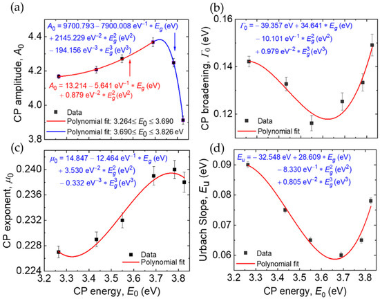 Best fitting variable parameters of lower energy CP (a) amplitude, (b) broadening, and (c) exponent, as well as the (d) Urbach slope representing the MZO dielectric function according to Equations (1) and (2).