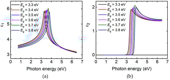 Analytically determined complex dielectric function (ε = ε1 − iε2) spectra for hypothetical MgxZn1−xO films with different Mg contents x and bandgap energies E0 = Eg. (a) photon energy of ε1; (b) photon energy of ε2. These spectra were determined from Equations (1) and (2) using the bandgap and linked Et value, seven fixed parameters, and four polynomial descriptions as presented in Table 2. The polynomial expressions in Table 2 enable linking the additional four parameters to the bandgap, enabling the dielectric function spectra to be specified by the single bandgap variable.