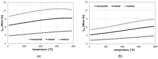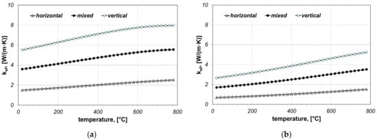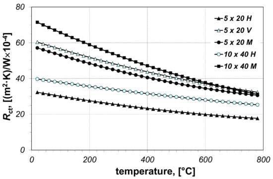 Samples 5 × 20 H and 10 × 40 M have the smallest and highest values of the resistance Rct, respectively. Therefore, it was assumed that the thermal contact resistance in the bundles of steel rectangular bars can assume values between these two extreme cases. Consequently, the effective thermal conductivity calculations were made for the two values of the thermal contact resistance (minimum Rct-min and maximum Rct-max). The changes in the resistances Rct-min and Rct-max, in relation to temperature, are described by the Equations (22) and (23) respectively