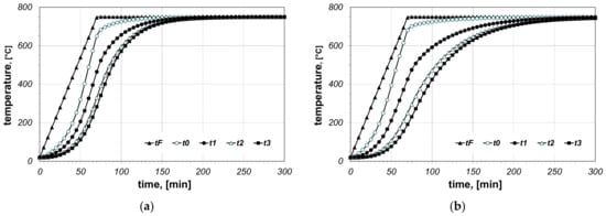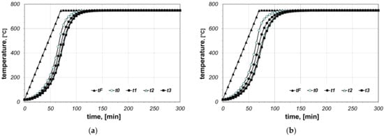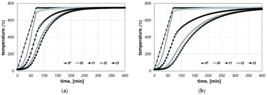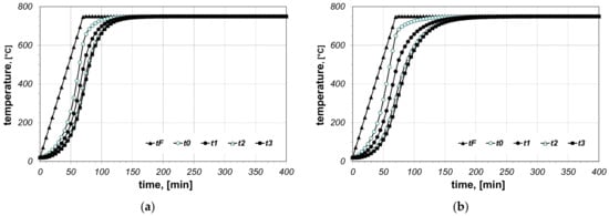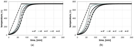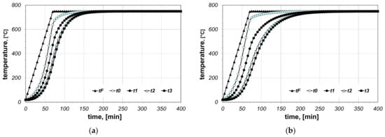 The results of the calculations of bundle heating obtained for the final furnace temperature equal to 750 °C, for chosen cases (type of arrangement and bar size), are presented in Figure 6, Figure 7, Figure 8, Figure 9, Figure 10 and Figure 11. The diagrams present the changes in furnace temperature tF, as well as four chosen points in the section of the bundle, in the time function. The marked points relate to the following locations of the charge: t0—r0 (the surface of the charge), t1—2/3 r0, t2—1/3 r0, t3—the axis of the charge. Each picture presents results for a sample with identical geometry, although differing in the value of thermal contact resistance. Diagrams marked with the letter (a) relate to resistance Rct-min; diagrams marked with the letter (b) relate to resistance Rct-max. Therefore, comparing both diagrams from one figure shows us the difference in the course of heating depending on the value of Rct resistance assumed in the model. As can be seen, the difference between the Rct-max and Rct-min values is changing in the temperature function.