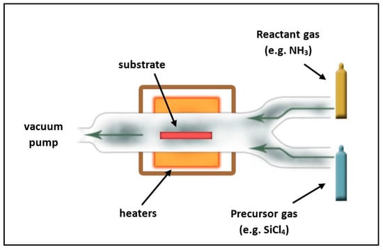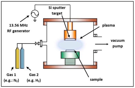 CVD is a widespread vacuum deposition method to prepare high quality thin films, where the desired film is created by the chemical reactions between precursor gases (raw materials) on the substrate surface. Many variants of CVD technology are known, of which the hot wire (HW-CVD) [21], expanded thermal plasma (ETP-CVD) [23], electron cyclotron resonance (ECR-CVD) [24], and plasma-enhanced (PE-CVD) [28] types are the most common for the deposition of SiNx and SiNx:H thin films. Figure 1 presents a schematic overview of a typical PE-CVD reactor.