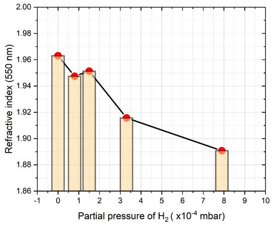 In the case of the deposition of SiNx:H thin films by the introduction of molecular hydrogen to the chamber, control of the hydrogen pressure serves as an alternative technique for tuning the refractive index of the thin films. Mokkedem et al. [90] studied the correlation of the hydrogen gas pressure and the refractive index of DC magnetron sputtered SiNx:H layers. It was revealed that when the partial pressure of H2 increased from 4.5 to 9 mPa, the refractive index showed a decreasing trend from 1.92 to 1.78. Considering that, in parallel, the increase of the nitrogen to silicon ([N]/[Si]) ratio from 1.03 to 1.22, as well as the increase of the hydrogen to silicon ([H]/[Si]) ratio from 1.47 to 1.65 were proved, the experienced variations of the refractive index should be attributed to the incorporation of H and N atoms into the layers. We experienced a similar correlation between the partial pressure of the hydrogen applied to the chamber and the refractive index at 550 nm of SiNx:H layers prepared by RF sputtering, as shown in Figure 5 [74].